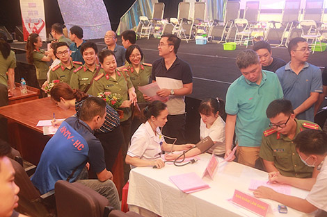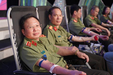 | Cán bộ, chiến sĩ Cục Truyền thông Công an nhân dân tham gia hiến máu tình nguyện tại Trường quay S1. |