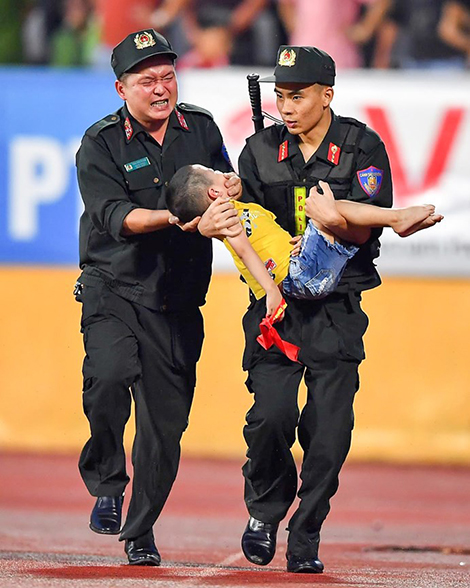 Khoảnh khắc chiến sĩ cảnh sát cơ động (CSCĐ) nén đau khi đặt ngón tay vào miệng cháu bé đang bị co giật được phóng viên Tiến Tuấn của Báo điện tử Tri Thức Trẻ chụp tại sân Thiên Trường (Nam Định) làm rung động lòng người.