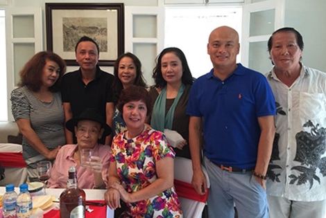 | Nhạc sĩ Thanh Tùng cùng con trai (đứng thứ hai bên tay phải) và những người bạn nghệ sĩ. |