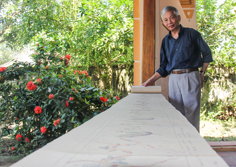 Giáo sư, viện sĩ Nguyễn Huy Mỹ với cuốn sách “Hoàng hoa sứ trình đồ” tại tư gia xã Song Lộc, Can Lộc, Hà Tĩnh. |