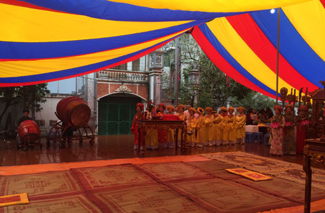 Hằng năm lễ hội cờ phướn rợp trời, trống dong cờ mở, người người nườm nượp nhưng năm nay do dịch bệnh xảy ra nên tịnh không có bóng dáng một chiếc cờ nào từ đầu làng đến cuối làng, chỉ treo một vài cờ ở trước cửa đình. Sân đình rộng, đội hành lễ do các bà, các chị xúng xính xiêm y áo đỏ, váy vàng, hòa với tiếng nhạc réo rắt, tiếng trống gọi mời đang cử hành làm lễ. Có dăm cụ ông ở đội lễ, chân đi guốc mộc, mặc áo dài đen, đầu đội khăn xếp.