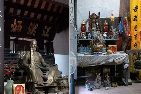 | Tượng thờ danh nhân Nguyễn Siêu và những bát hương không đủ chỗ để. |