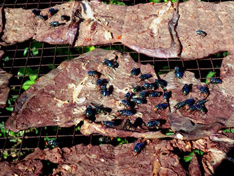 | Những miếng phổi heo giả làm khô bò bu đầy nhặng xanh. |