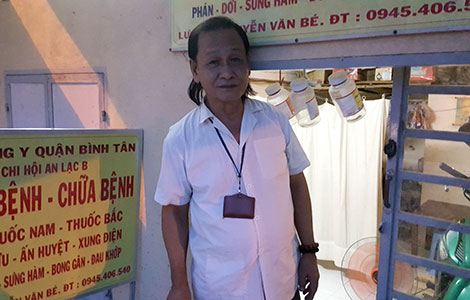 Gần nhà chị Diệu là nhà của lương y Nguyễn Văn Bé. Bước vào nhà ông Bé chúng tôi thấy có 2 cái lạ. Thứ nhất là mấy cái chai treo lủng lẳng ở lối ra vào. Thứ hai là quạt điện mở hết công suất… thổi ra đường. Lương y Nguyễn Văn Bé giải thích: Mấy cái chai treo lủng lẳng trước cửa để người ra vào không bị thương. Chẳng là trước đó một vài bệnh nhân của ông, kể cả ông bị chảy máu đầu do vô ý đụng vào “cửa hầm”. Giờ thì mọi người an tâm do đã có “hàng rào bảo vệ”.
