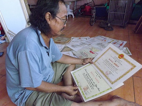| Nghệ sĩ Ngọc Viên đang ưu tư bên những tấm bằng khen mà đoàn xiếc khổ luyện. |