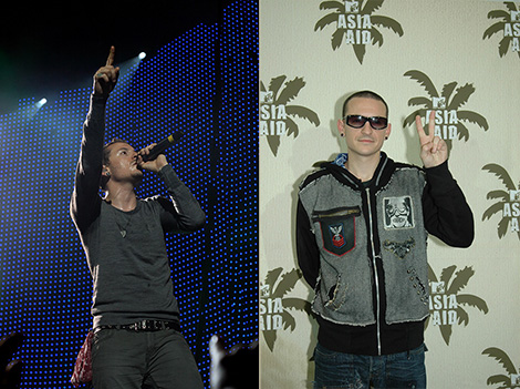 | Chester biểu diễn tại The Globe Arena ở Stockholm (ảnh trái); Chester đại diện cho Linkin Park tại MTV's Asia Aid 2005. |