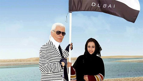 Nhà tạo mẫu K.Lagerfeld (trái) trong lễ động thổ quần thể Thành phố Mốt đồ sộ ở Dubai (Các Tiểu vương quốc Ảrập Thống nhất).