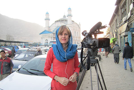 Nhà báo Sally Sara đang tác nghiệp tại thủ đô Kabul (Afghanistan), sau lưng bà là thánh đường Hồi Giáo "Mosque of the King of Two Swords" nổi tiếng.