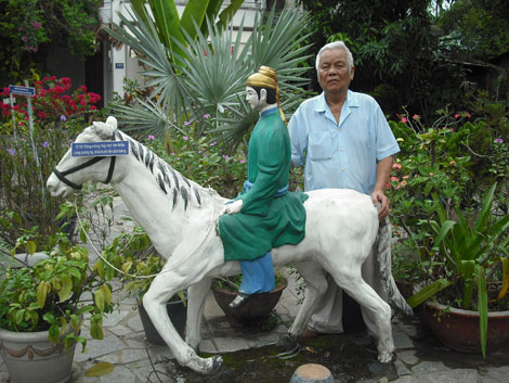| Ông Phạm Văn Khoát bên bức tượng Kim Trọng trong Vườn Kiều. |