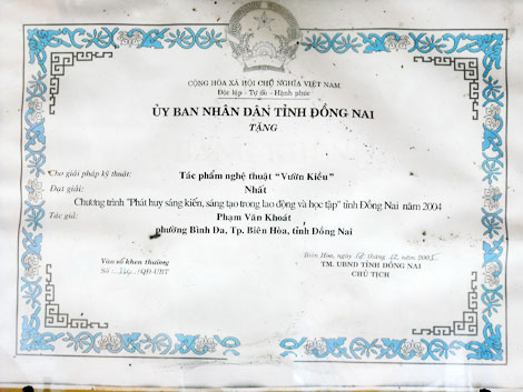 | Bảng khen giải Nhất do UBND tỉnh Đồng Nai trao cho Vườn Kiều của ông Khoát. |