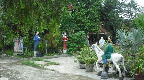 Đến một khu đất, ông Khoát chỉ: "Đây là Quan Âm các, nơi Hoạn Thư (vợ Thúc Sinh) bắt Kiều ra đó ngày ngày tụng kinh, gõ mõ, đày đọa nàng vì ghen”. Tôi nhìn theo hướng ông Khoát. Đó là một cái am nhỏ làm bằng xi măng, kích thước cỡ 40x50x60cm, xung quanh là hoa cỏ và một cây bồ đề. Ông Khoát dẫn chúng tôi đi qua một cái cổng làm bằng cây, phía trên treo hai con chim và câu thơ: “Trong khi chắp cánh liền cành/ Mà lòng rẻ rúng đã dành một bên”. Đây là câu nàng Kiều phân trần với Kim Trọng khi lần đầu hai người hẹn hò, tư tình mà Kim Trọng "xem trong âu yếm có chiều lả lơi" thì Kiều từ chối và phân trần như trên.