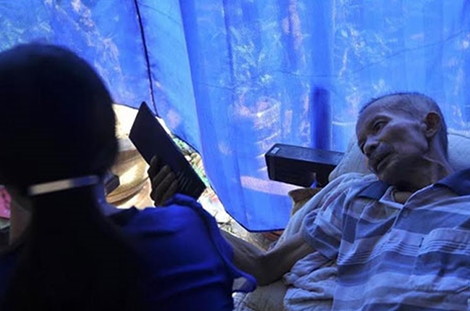 | Thầy giáo Nguyễn Hữu Tinh những ngày cuối trên giường bệnh với tập thơ của mình. |