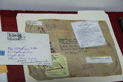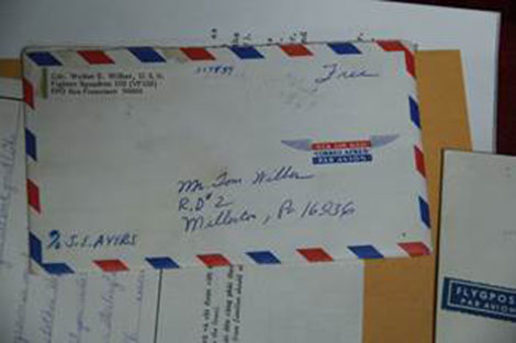 | Một trong các kỷ vật là lá thư và bao thư ông Thomas Eugene Wilber lúc ấy tự làm và gửi sang Việt Nam cho cha mình – cố phi công Hải quân bị tạm giam tại nhà tù Hỏa Lò. |