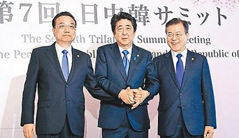 | Thủ tướng Trung Quốc Lý Khắc Cường, Thủ tướng Nhật Bản Shinzo Abe và Tổng thống Hàn Quốc Moon Jae-In. |