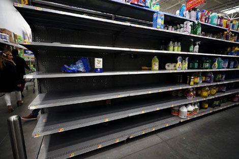 3. Không chỉ thực phẩm, nước rửa tay khô, dân Mỹ còn “quét sạch” giấy vệ sinh, khẩu trang và một số loại thuốc bán không cần đơn bác sĩ. Hình ảnh dòng người nối dài và những kệ hàng trống rỗng ở các siêu thị đã trở nên phổ biến, kể cả ở những vùng chưa có dịch mặc dù các hãng sản xuất không ngớt đề nghị mọi người nên bình tĩnh, đừng hoảng hốt vì họ bảo đảm sẽ cung ứng đủ.