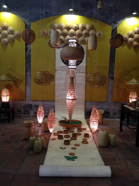| Một số sản phẩm của nghệ nhân Nguyễn Văn Trung (làng nghề mây tre đan Phú Vinh, Phú Xuyên, Hà Nội) trưng bày tại đình Kim Ngân. Ảnh: Đặng Thủy. |