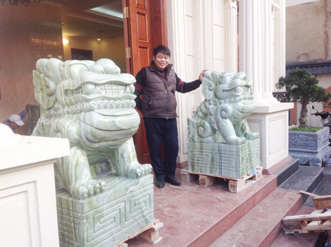 | Tiến sĩ Lê Xuân Phương bên cạnh hai con nghê đá mới được chế tác theo mẫu cổ. |