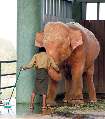 | Quản tượng đang chăm sóc con bạch tượng ở thủ đô Naypyidaw. |