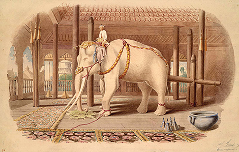 | Tranh vẽ cảnh voi trắng trong triều đình Miến Điện vào năm 1855. |