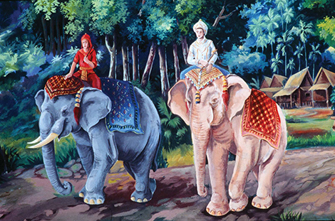 | Tranh vẽ truyền thống về những chú voi trắng được tô điểm nhiều vàng. suốt một thời gian dài chúng được cho là biểu tượng của sự giàu có và quyền lực bởi các hoàng gia ở Đông Nam Á. |