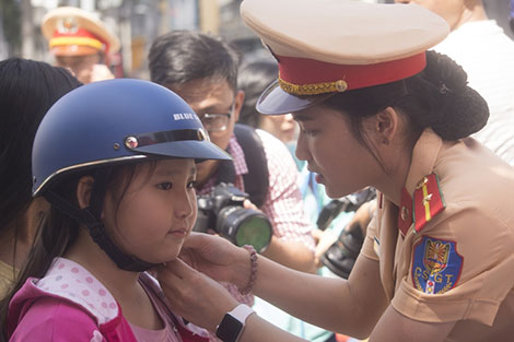 | Nữ Cảnh sát giao thông tặng mũ bảo hiểm cho học sinh. |