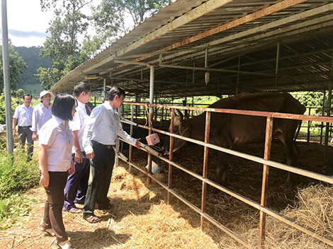 | Chiều 2-10, cán bộ chức năng tỉnh Ninh Thuận khảo sát đàn bò lai đang nuôi nhốt để tìm phương án giải cứu. Ảnh: Bùi Phụ. |