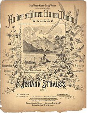 | Bìa bản nhạc “The Blue Danube” phổ biến khắp Âu lục ngay từ cuối thế kỷ XIX. |