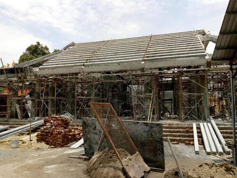 | Ngôi đình cổ 300 tuổi Lương Xá được thay thế bằng bê tông cốt thép khi tu bổ. |