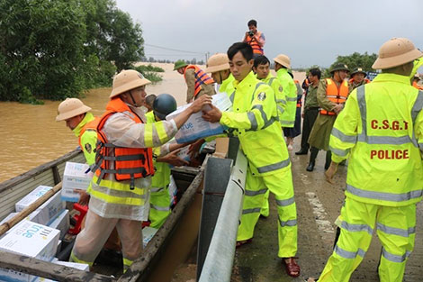 Tại Huế, nước lũ xối xả khiến QL1 qua nhiều địa bàn ngập sâu, chia cắt, có những nơi nước cao hơn 1m. Chính vì vậy, lực lượng CSGT tăng cường tối đa lực lượng ứng trực 24/24h ở các điểm ngập, ngăn không cho phương tiện qua lại, ở những điểm ngập nhẹ, anh em đứng giữa trời mưa làm "cọc tiêu sống" để hướng dẫn các phương tiện đi qua an toàn.