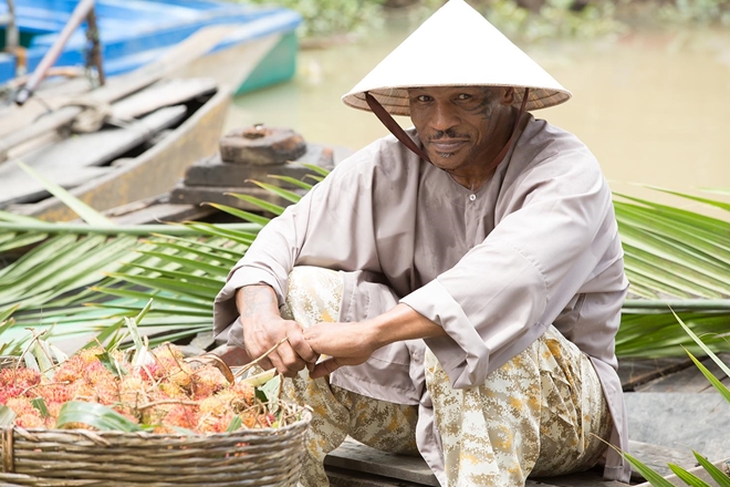 | Hình ảnh Mike Tyson đội nón lá, mặc áo bà ba trong phim “Những cô gái và Găng-tơ”. |
