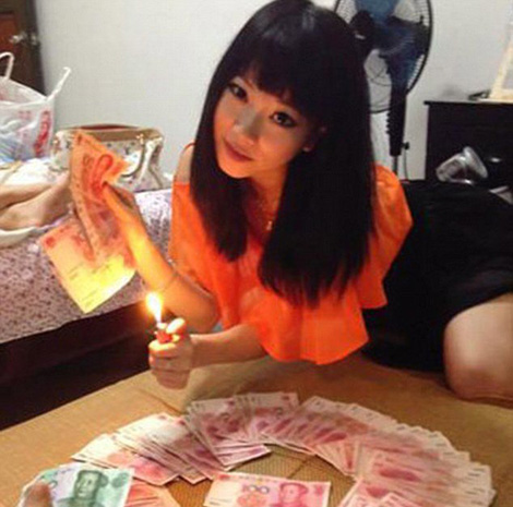 | Một tiểu thư Trung Quốc khoe sự giàu có bằng cách đốt tiền. |