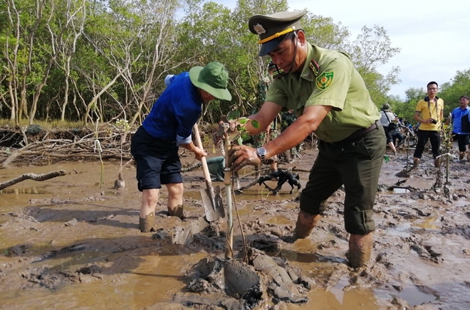 | Các đoàn viên thanh niên và lực lượng kiểm lâm trồng rừng phòng hộ ven biển, phường Nhà Mát (Bạc Liêu). |