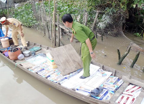 Lúc này, 2 đối tượng trên ghe điều khiển phương liện lao nhanh vào bờ rồi bỏ ghe tẩu thoát. Qua kiểm tra, lực lượng phát hiện và thu giữ 9.480 gói thuốc lá ngoại nhập lậu.