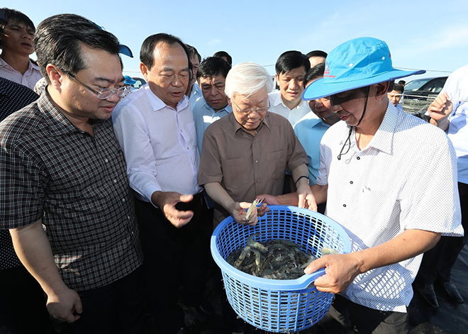 | Tổng Bí thư, Chủ tịch nước Nguyễn Phú Trọng thăm khu nuôi tôm công nghiệp ứng dụng công nghệ cao của Công ty cổ phần Trung Sơn ở xã Trung Hóa, huyện Kiên Lương, tỉnh Kiên Giang. Ảnh: TTXVN |