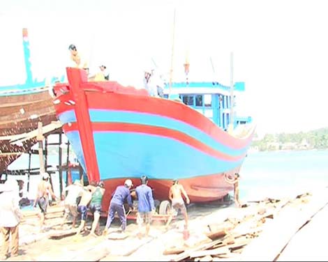 | Ngư dân xã Nghĩa An (Tp Quảng Ngãi) hạ thủy tàu mới chuẩn bị vươn khơi. |