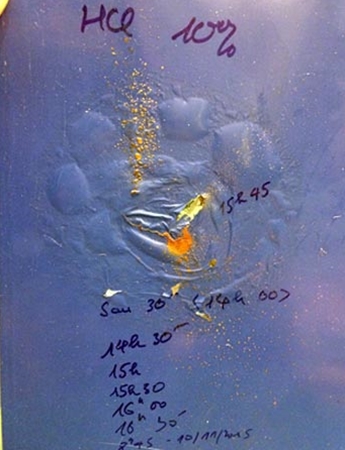 | Tấm tôn xanh dương của Công ty Phong Phú bị bong bóc chỉ sau 2h nhỏ axit HCL. |