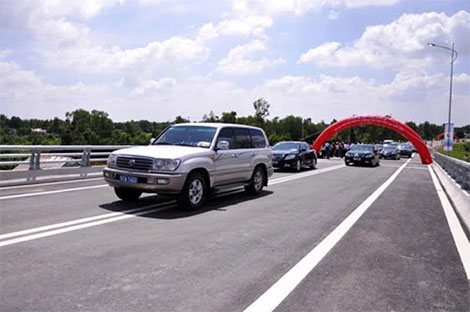 | Lãnh đạo Bộ GTVT, các tỉnh ĐBSCL cắt băng khánh thành cầu Mỹ Lợi. |