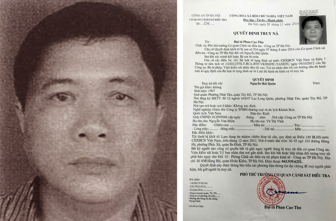 | Đối tượng Nguyễn Hải Quân và quyết định truy nã. |