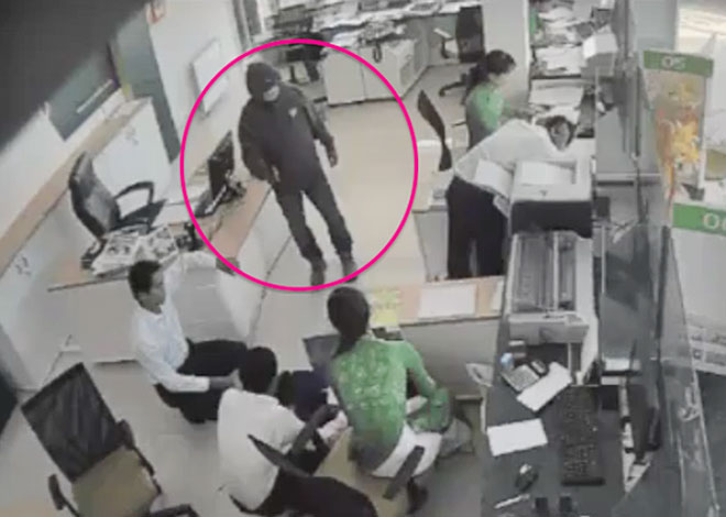 | Hình ảnh đối tượng Hưng dùng súng đe dọa nhân viên ngân hàng. |