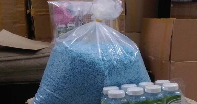 Mở rộng khám xét 6 địa điểm liên quan đến đường dây sản xuất, chứa trữ, tiêu thụ TPCN và tân dược giả, cơ quan chức năng thu giữ nhiều phương tiện, dụng cụ dùng để sản xuất hàng giả và số lượng lớn tân dược, TPCN giả thành phẩm cùng hàng trăm kg nguyên liệu. Ước tính, tổng giá trị hàng hóa tân dược, TPCN giả bị tạm giữ trị giá tương đương hàng chục tỷ đồng (so với hàng thật).