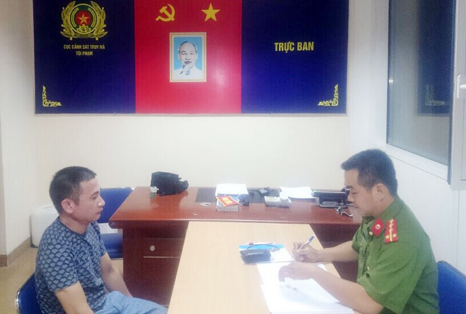 | Đối tượng truy nã Nguyễn Phi Nam khai báo tại cơ quan Công an. |
