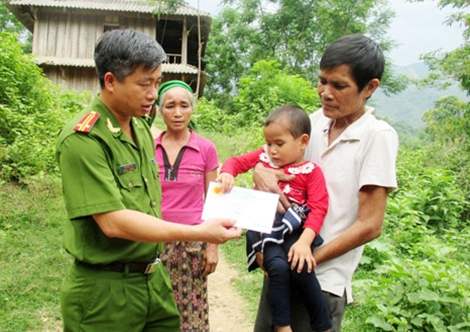 | Trung tá Trần Phúc Tú, Trưởng Công an huyện Tương Dương trao quà hỗ trợ gia đình cháu bé. |