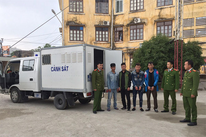 | Công an huyện Ninh Giang dẫn giải 4 đối tượng gây án. |
