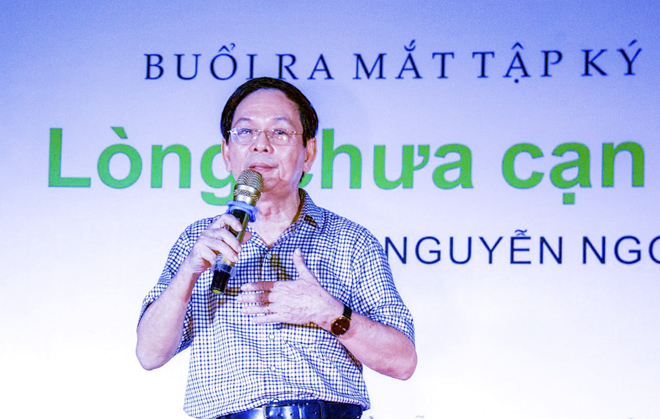 | Tác giả Nguyễn Ngọc Hạnh trong buổi ra mắt tập ký - phê bình “Lòng chưa cạn đêm sâu”. |
