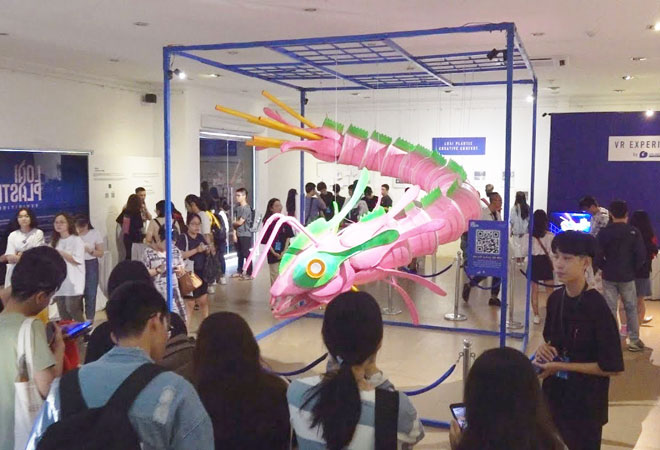 | Mô hình quái vật trong triển lãm "Loài Plastic" thu hút đông đảo bạn trẻ tham quan. |