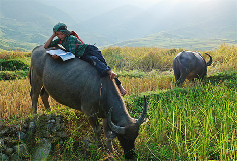 | Trẻ em ở quê vẫn tranh thủ vừa chăn trâu vừa đọc sách. |