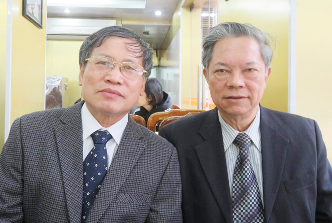 | Nhà thơ Đinh Quang Tốn (phải) và tác giả bài viết. |