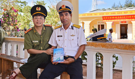 | Thượng tá, nhà thơ Phạm Khải (bên trái) tặng sách “Thêm một lần biển gọi” cho đại diện cán bộ, chiến sĩ đảo Sơn Ca, quần đảo Trường Sa (sáng 23-4-2016). Ảnh: Đinh Thành Đức. |
