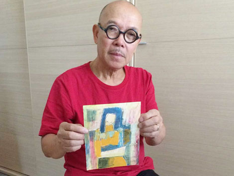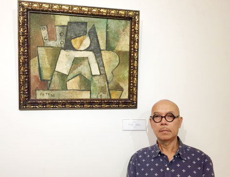 Họa sĩ Thành Chương bên bức phác thảo được cho là bản gốc của bức tranh ký tên họa sĩ Tạ Tỵ, (mà thực chất là tranh của Thành Chương).