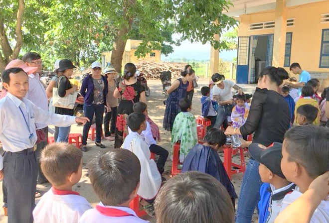 | Thầy Khoa còn vận động các đoàn thiện nguyện đến trường cắt tóc miễn phí cho học trò. |